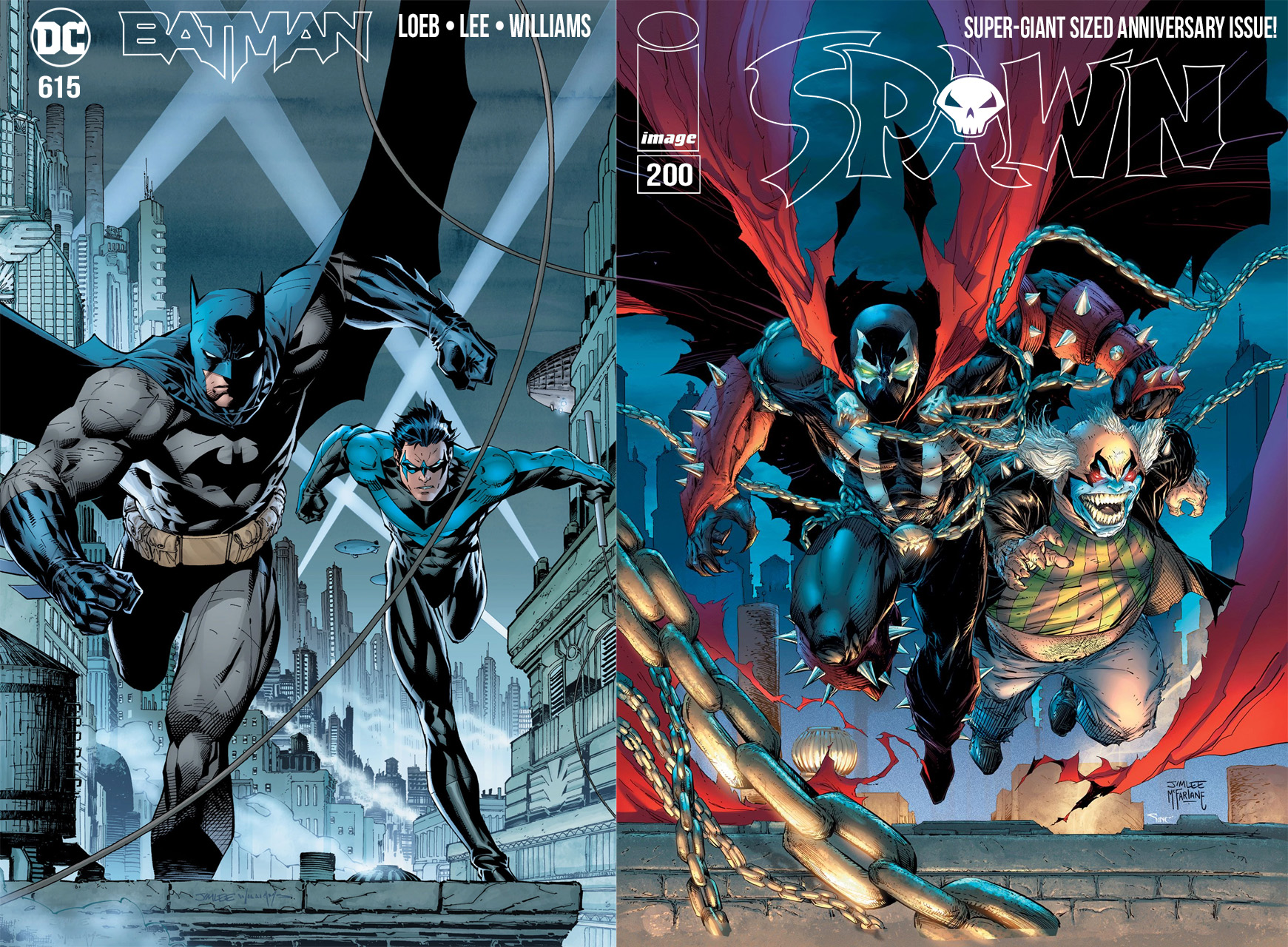 Ainda sobre a edição histórica número 200 de Spawn, houve uma capa variante desenhada pelo artista Jim Lee que merece estar nesta lista, pois foi uma auto-homenagem que ele fez a si mesmo referente a capa de Batman (junto do Asa Noturna) que ele desenhou pra DC Comics. A posição não é exatamente a mesma (diferente das capas que vem a seguir), porém a composição (e a ideia) geral, sim.